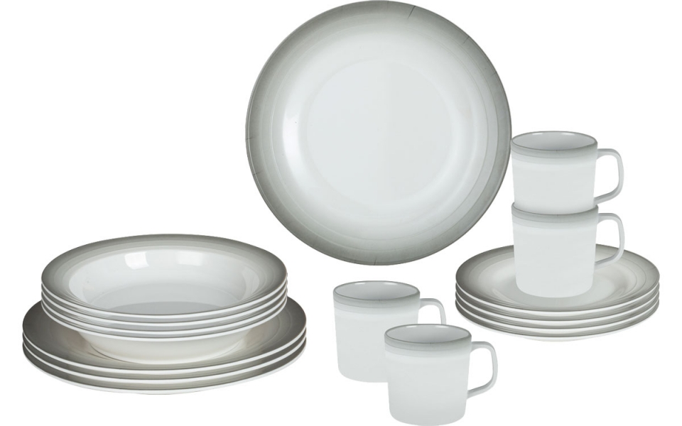 16dílná sada nádobí vyrobená z vysoce kvalitního melaminu. Vhodné do myčky na nádobí, odolné proti rozbití, bez zápachu a chuti a vhodné pro potraviny. Nevhodné do mikrovlnné trouby!