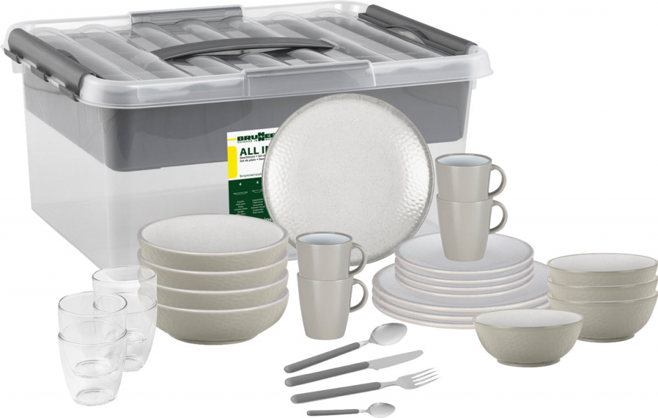 40dílná sada skládající se ze 4 jídelních talířů ø 25 cm, 4 polévkových talířů ø 20 cm, 4 dezertních talířů ø 20 cm, 4 misek ø 15 cm, 4 hrnků 30 cl, 4 sklenic 20 cl a 16dílné sady příborů.