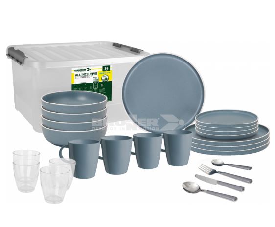 36dílná melaminová sada skládající se ze 4 jídelních talířů ø 25 cm, 4 dezertních talířů ø 20 cm, 4 polévkové talíře ø 20 cm, 4 hrníčky s rukoj30 cl, 4 sklenice po 20 cl a 16dílná sada příborů (4 x lžíce, 4 x vidlička, 4 x nůž a 4 x čajová lžička).