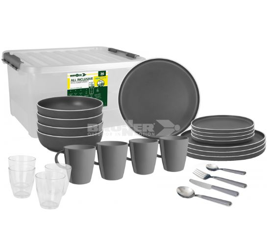 36dílná melaminová sada skládající se ze 4 jídelních talířů ø 25 cm, 4 dezertních talířů ø 20 cm, 4 polévkové talíře ø 20 cm, 4 hrníčky s rukoj30 cl, 4 sklenice po 20 cl a 16dílná sada příborů (4 x lžíce, 4 x vidlička, 4 x nůž a 4 x čajová lžička).
