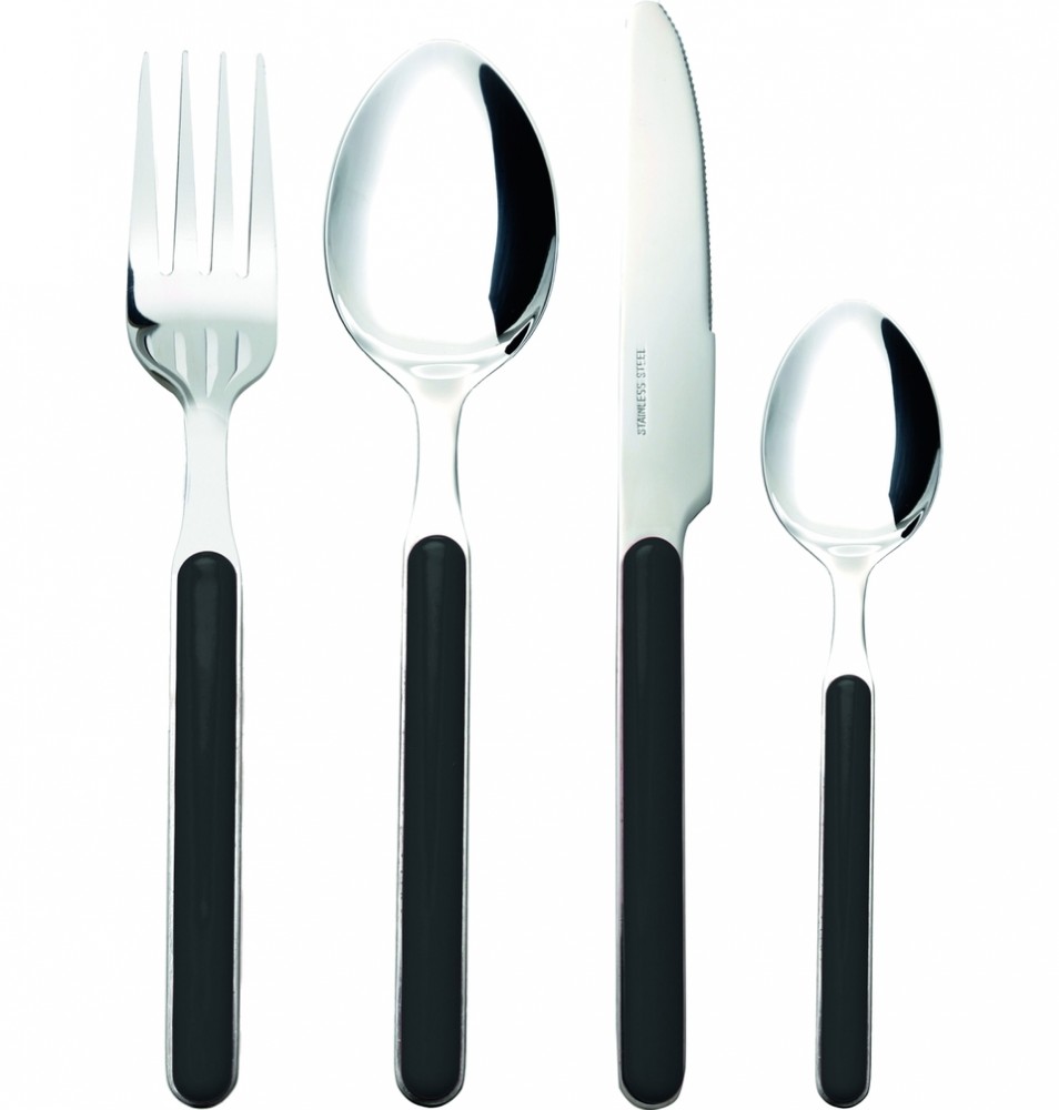 16dílná sada příborů s pevným nerezovým kovovým jádrem a plastovými rukojeťmi. Sada se skládá ze 4 x nože, 4 x vidličky, 4 x lžíce a 4 x čajové lžičky.