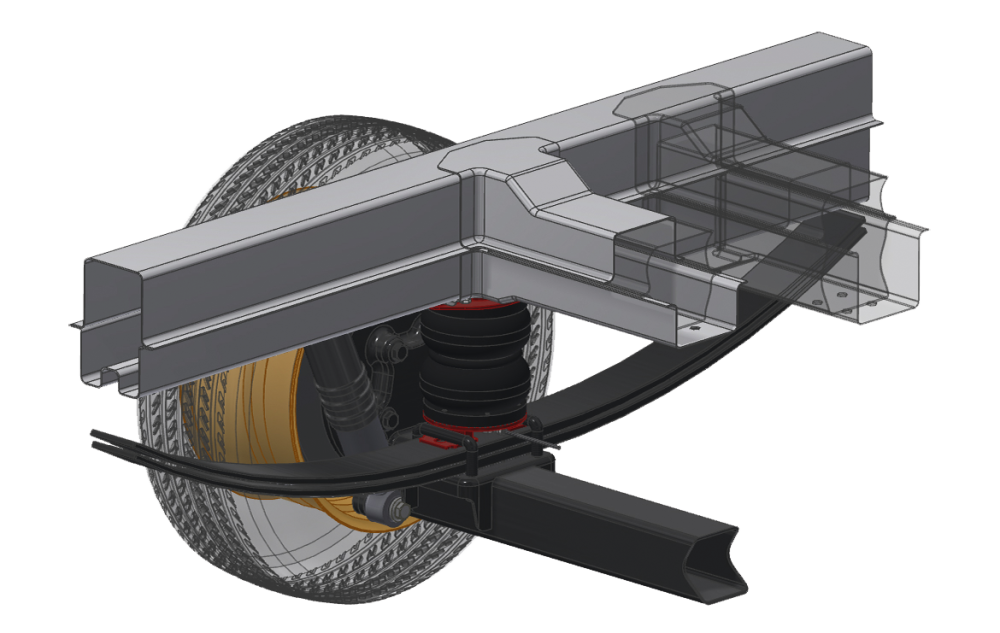 Přídavná vzduchová pružina pro zadní nápravu. Vedle původních pružin jsou instalovány výkonné přídavné vzduchové pružiny. Platí stejné vlastnosti jako pro přídavné vinuté pružiny.