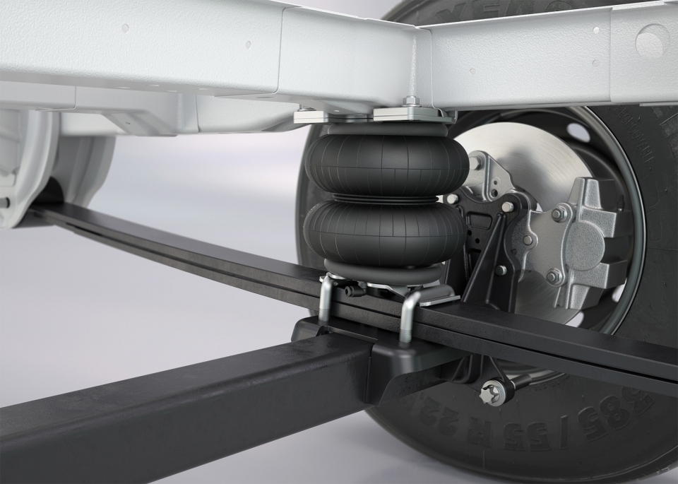 Mezi vozidlem a nápravou jsou instalovány pomocné vzduchové pružiny od GOLDSCHMITT. Namontované na rámu a nápravě vyztužují a doplňují standardní ocelové pružiny. Kvalitní vzduchové měchy vyrovnávají rozdíly zatížení, zlepšují jízdní vlastnosti a v případě potřeby zajišťují zvednutí zadní části vozidla. Pokud standardní užitečné zatížení nestačí, je u mnoha běžných modelů dodávek možné zvýšení užitečné hmotnosti. Rozsah dodávky: Kompresor, ovládací panel v kabině řidiče, manometr, montážní materiál, technická dokumentace. Model z roku 2014. 2-okruhový přídavný systém vzduchového odpružení pro zadní nápravu 8". Ovládací panel specifický pro vozidlo bez osvětlení LED.