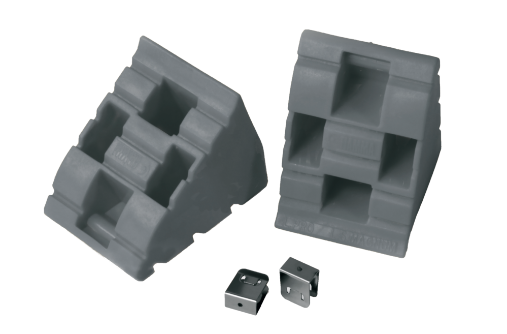 Dvojice klínů pod kola pro bezpečné zajištění pneumatik při delších zastávkách.
