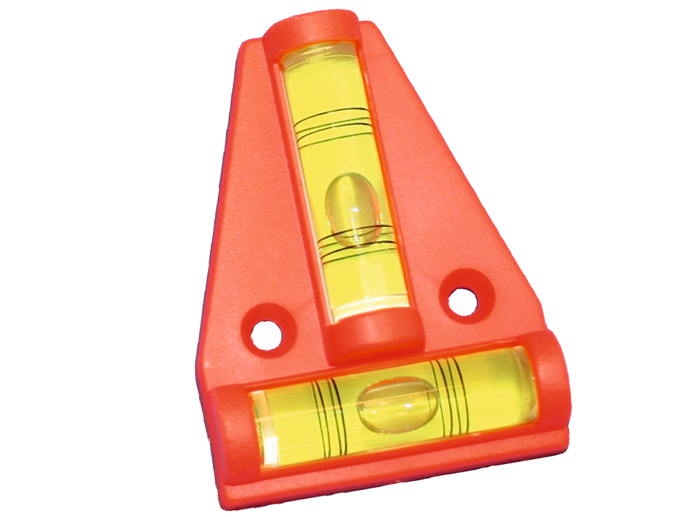 Trojúhelníková vodováha s kolmými libelami a montážními otvory.