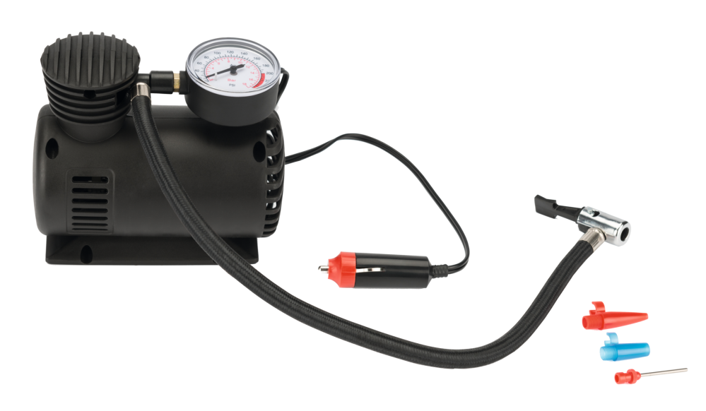 12 V/10 A, 250 PSI/17 bar, připojovací kabel s 12V zástrčkou do zapalovače cigaret, 3 adaptéry, délka hadice cca 0,5 m.