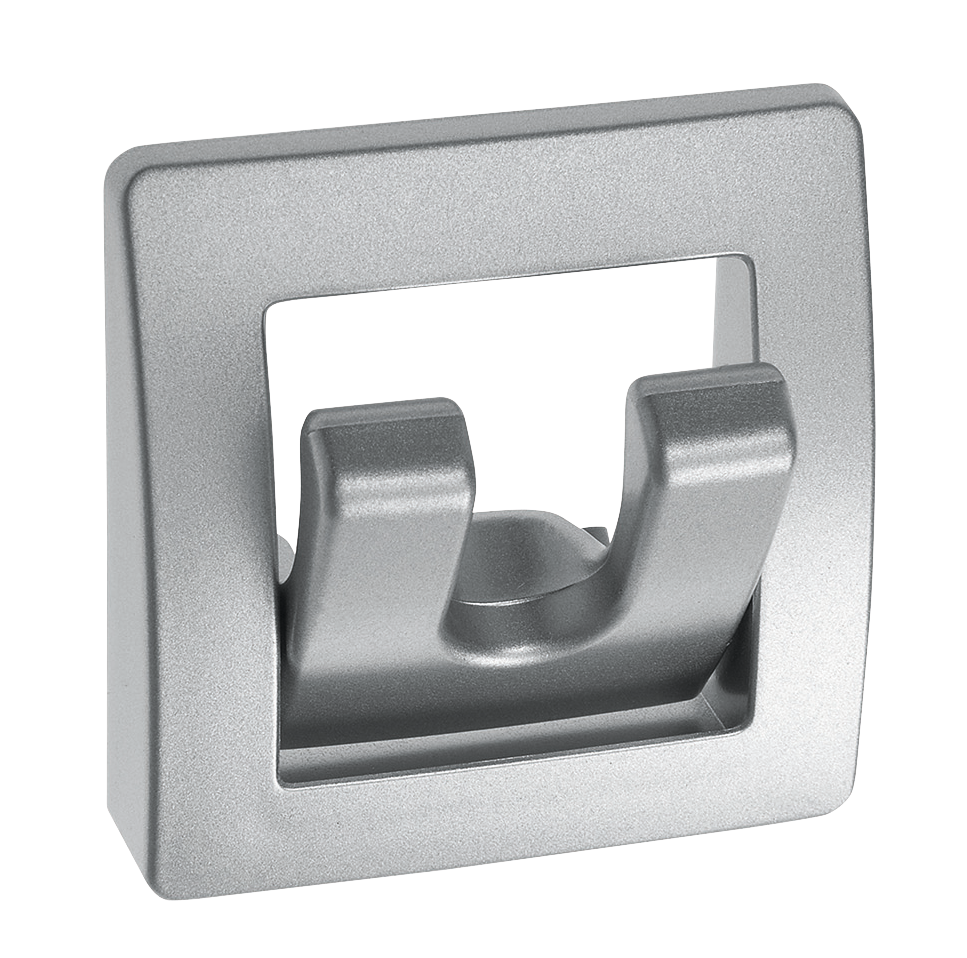 Vyrobeno z tlakově litého zinku. Rozměry (Š x V x H) 57 x 58 x 12/30 mm. Se dvěma skládacími háky.