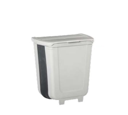 Skládací odpadkový koš. Ručně otevíratelný odpadkový koš s víkem. Díky skládacímu systému se jeho objem, když se nepoužívá, může snížit o více než 50 %. Lze použít samostatně nebo zavěsit na stěnu nebo dveře. Objem 8l.