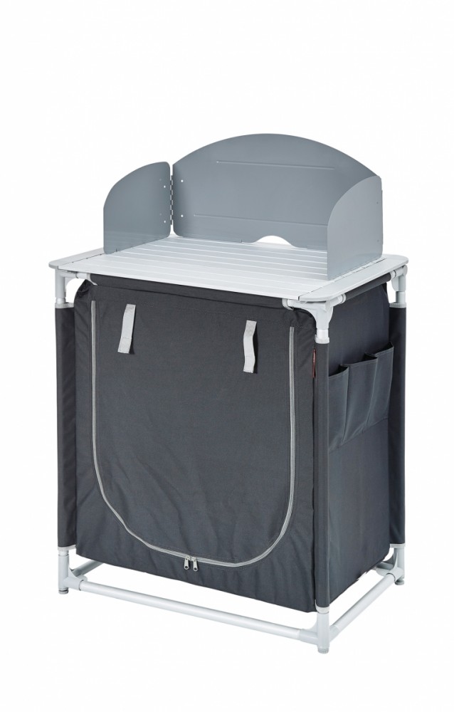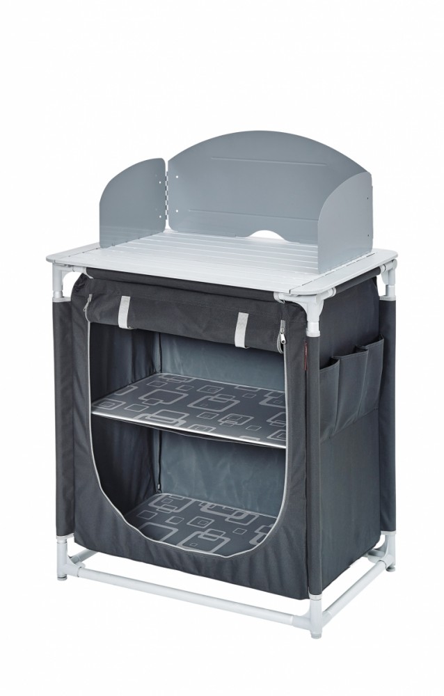 Potah z 600D polyesteru potaženého PVC (100% polyester), rám z hliníku ø 25 mm. Dvě police potažené hliníkem, tři boční kapsy, ochrana proti větru. Obsahuje tašku na přenášení.