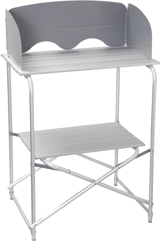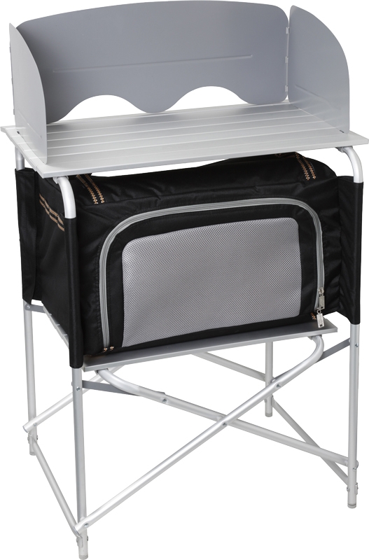 Skládací kuchyňský box s pracovní deskou. Na kolečkách, spodní police s vyjímatelnou látkovou skříní a s užitečnou ochranou proti větru a stříkající vodě. Noha s nastavením výšky. Lze rychle a snadno postavit a demontovat. Velmi kompaktní v zavřeném stavu, a proto se snadno složí. Kompletní s pevným pouzdrem.