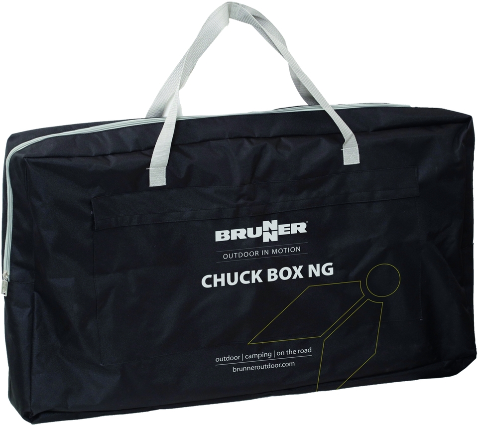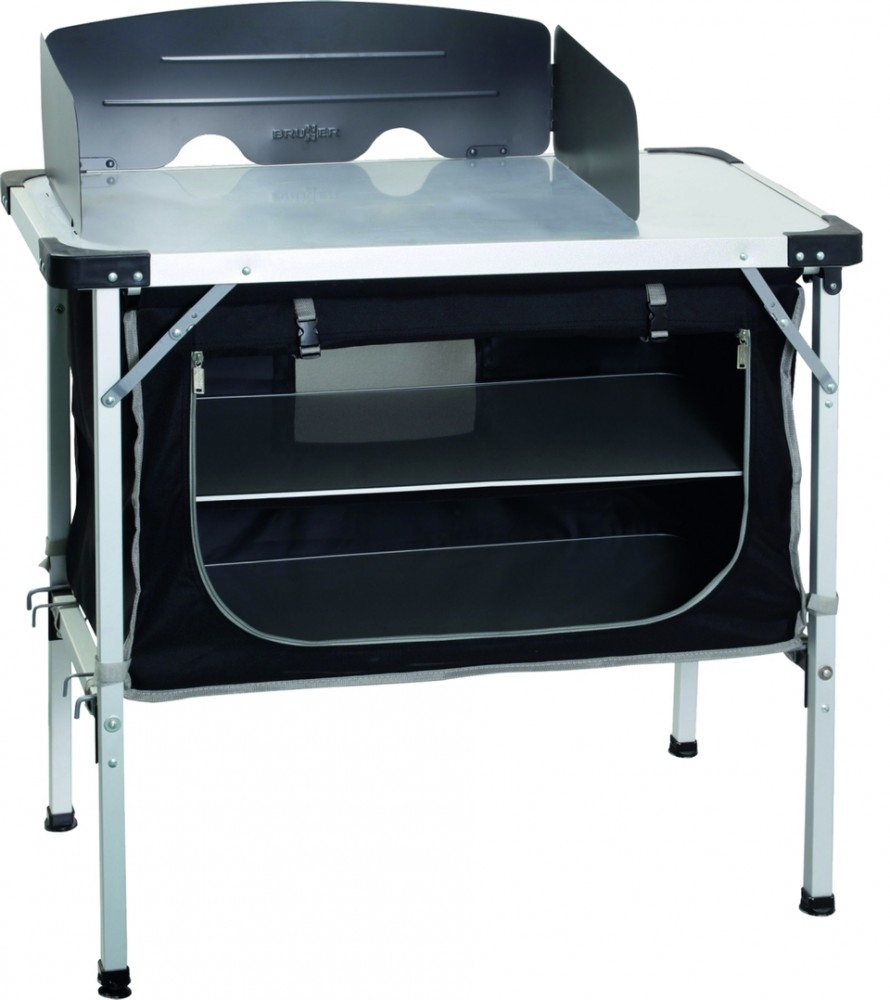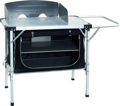 Kuchyňský box s extra pevným hliníkovým rámem a velkou pracovní deskou z MDF s hliníkovým lemováním po celém obvodu. Celý kuchyňský box je zabalen v dodávané přepravní tašce (100% polyester). Lze snadno postavit a sundat. Velká skříň s dveřmi na zip nabízí dostatek úložného prostoru pro potraviny a kuchyňské potřeby. S bočním skládacím rámem pro skládací pracovní dřez.
