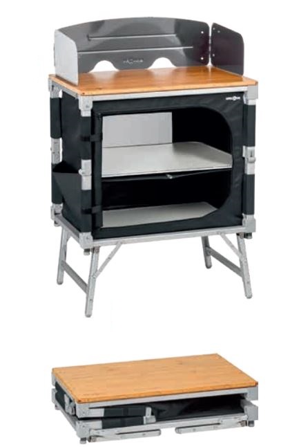 Přenosná skládací kuchyňská skříňka se zcela novou, prostorově úspornou bezmontážní hliníkovou konstrukcí. Výškově nastavitelné nohy, police z bambusového dřeva, kovová ochrana proti větru/stříkání. Textilní skříň z odolné, potažené polyesterové tkaniny (100% polyester). S úložným vakem.
