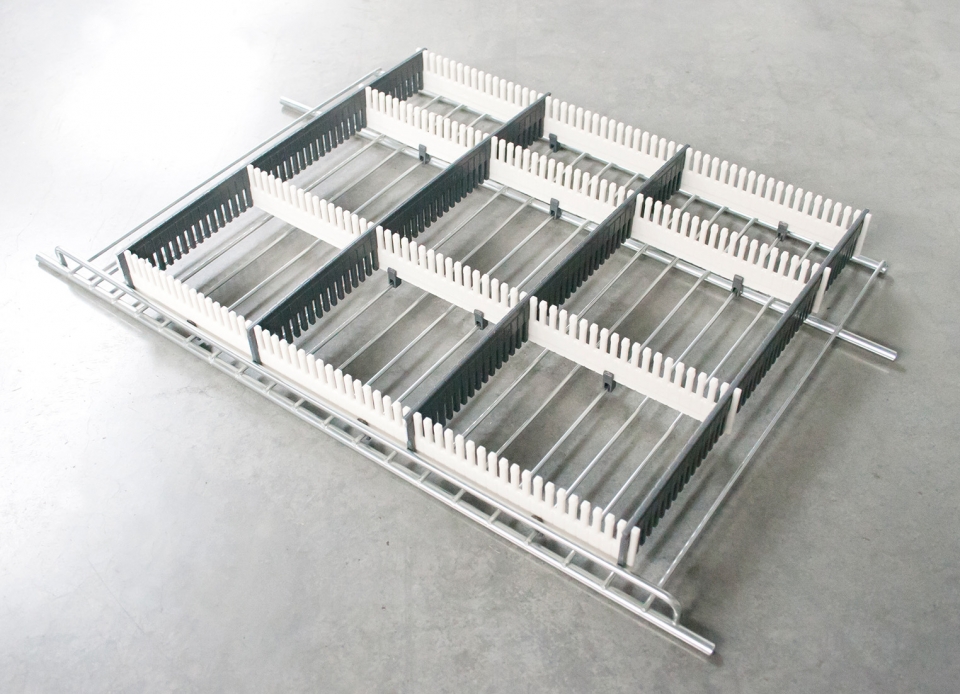 Zásuvný systém se skládá z 8 pružných plastových odkládacích proužků, které lze individuálně přizpůsobit každé velikosti přihrádky. Lze řezat na míru - každých 5 mm je perforace. Díky úzké mřížce