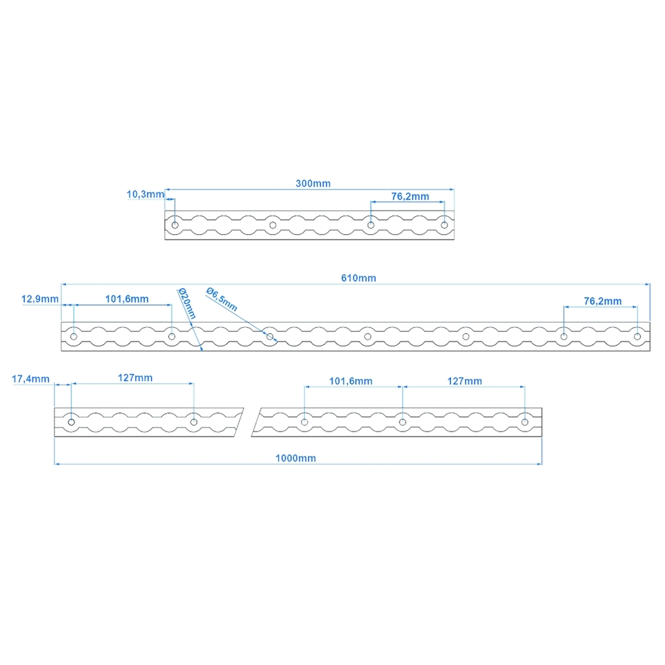 6dílná sada skládající se z: 2 x lišta 60 cm dlouhá a 4 x montážní oka včetně šroubů.