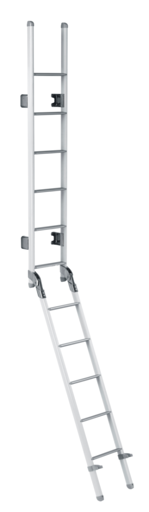 Skládací dvojitý žebřík pro montáž na zadní stěnu. Délka ve složeném stavu: 158 cm, délka v rozloženém stavu: 270 cm. Šířka: 30 cm.