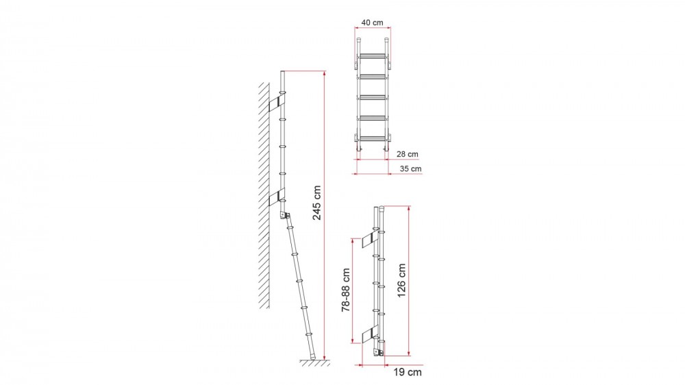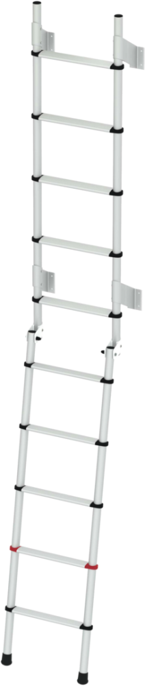 Zadní žebříky Deluxe. Robustní a lehké venkovní žebříky pro obytné vozy. Průměr 30 mm, tloušťka 2 mm z eloxovaného hliníku. Šířka 28 cm, vnější rozměry 35 cm, v souladu s normou UNI EN 131. Protiskluzové schůdky.
