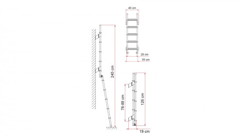 Celková délka 245 cm, složená 126 cm. Celková šířka 40 cm. Hloubka 19 cm.