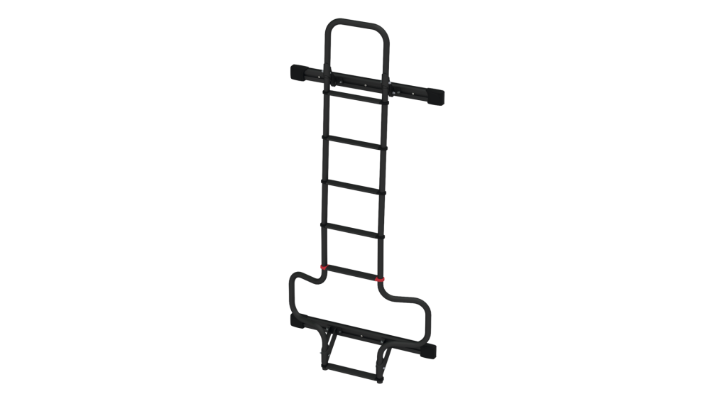 Zadní žebříky Deluxe. Robustní a lehké venkovní žebříky pro obytné vozy. Průměr 30 mm, tloušťka 2 mm z eloxovaného hliníku. Šířka 28 cm, vnější rozměry 35 cm, v souladu s normou UNI EN 131. Protiskluzové schůdky.