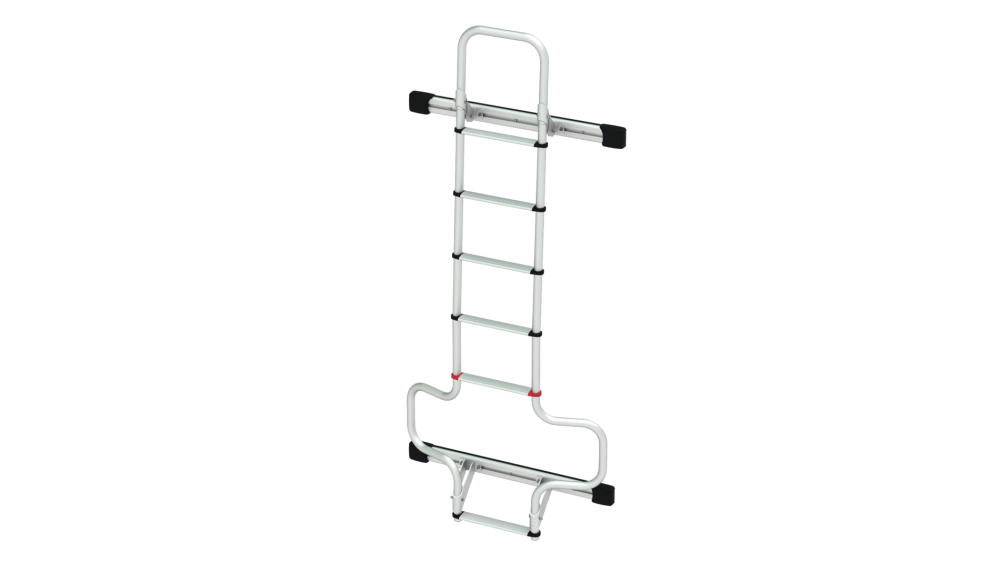 Zadní žebříky Deluxe. Robustní a lehké venkovní žebříky pro obytné vozy. Průměr 30 mm, tloušťka 2 mm z eloxovaného hliníku. Šířka 28 cm, vnější rozměry 35 cm, v souladu s normou UNI EN 131. Protiskluzové schůdky.