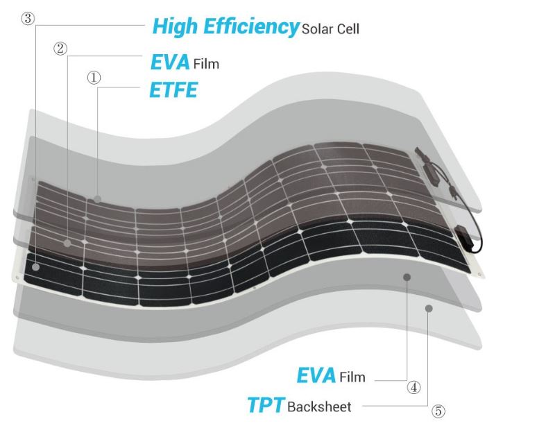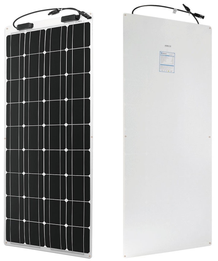 Flexibilní solární panel znamená, že panel je ohebný, není v pevném rámu a lze jej připevnit i na nerovné podklady. Poloměr povoleného ohybu je 5m.