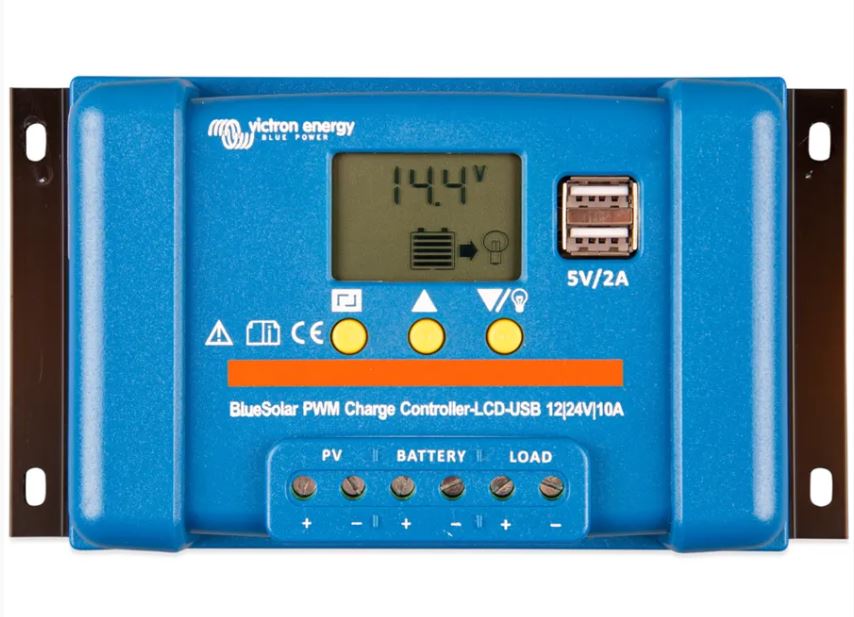 PWM solární regulátor Victron Energy BlueSolar-LCD&USB 10A. PWM solární regulátor s integrovaným LCD a USB 10A 12V/24V. Vhodný pro malé panely do 120Wp. Svou konstrukcí je určen pro malé ostrovní solární systémy. Pro nabíjení 12V baterie musí mít solární panel 36 článků, nebo pro nabíjení baterie 24V musí mít panel 72 článků a maximálním proud do 10A.
