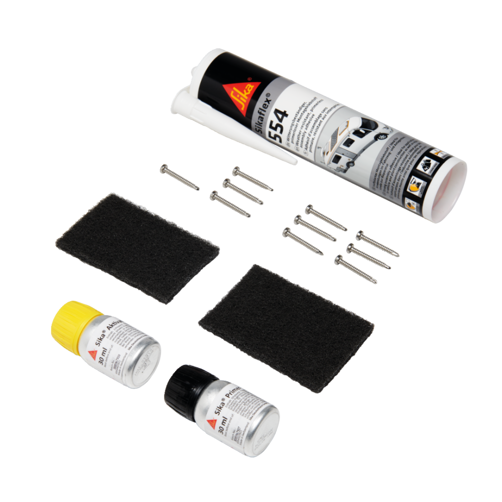 Lepidlo-čistič 205, Primer 210T, Sikaflex 252, šrouby z nerezové oceli, příslušenství a návod k lepení.