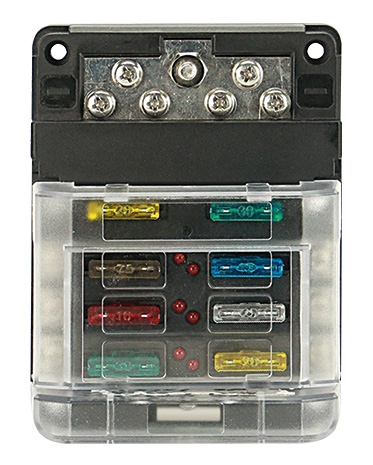 Kompaktní rozvaděč se 6 plus výstupy (M4). Napájení je dodáváno přes centrální vstup (M 5). LED indikátor přepálených pojistek. Výstupy lze zatížit až 30 A, celková zátěž 100 A. Dodávka bez pojistek (typ: FS).