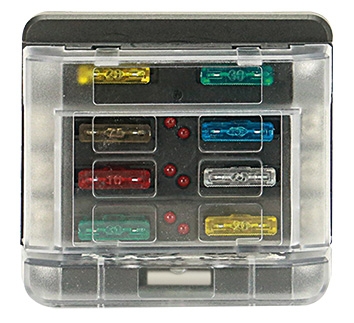 Kompaktní plus rozvaděč se 6 plus výstupy (M4). Napájení je dodáváno přes centrální vstup (M 5). LED displej pro vadné pojistky. Výstupy lze zatížit až 30 A, celková zátěž 100 A. Dodávka bez pojistek (typ: FS).