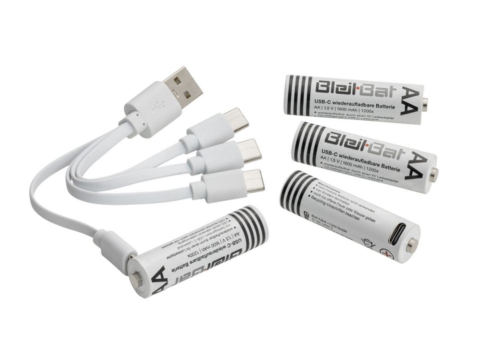 Dobíjecí Li-ion baterie s nabíjecím kabelem USB-C. Nabíjení pomocí nabíjecího kabelu USB-C. Na nabíjecím kabelu je červená LED dioda, která během nabíjení bliká. Jakmile je baterie plně nabitá, červená LED svítí nepřetržitě. Baterii lze připojit k libovolnému standartnímu 5V nabíjecímu kabelu. Doba nabíjení 2 hodiny, dobíjecí 1200krát.
