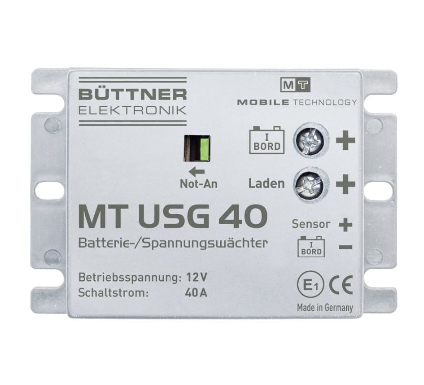 Monitor baterie/napětí MT USG 40 se připojuje mezi baterii a 12V spotřebiče. Chrání baterii a spotřebiče před škodlivým podpětím (vypnuto při 10,7 V) a připojené spotřebiče před škodlivým přepětím (vypnuto při 15,5 V). MT USG 40 lze ovládat dálkově přes spínací výstup a lze jej tedy použít také jako hlavní vypínač (všechny spotřebiče VYP/ZAP).