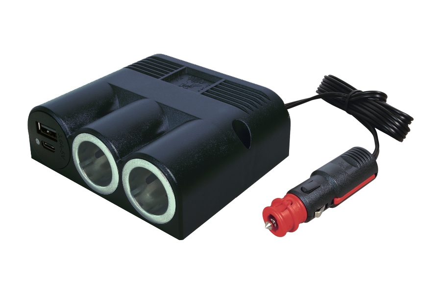 Trojitá zásuvka s 1 dvojitou zásuvkou Power USB-C/A, 2 napájecími zásuvkami a univerzální zástrčkou. 1 napájecí USB-C/A dvojitá zásuvka 12-24 V/5 V, 3,6 A s integrovaným měničem napětí. Pro nabíjení a obsluhu elektronických zařízení vyžadujících vysoký nabíjecí proud. Ochrana proti přetížení, ochrana proti přehřátí, ochrana proti přepólování, ochrana proti zkratu, ochrana proti přepětí a zkratu napěťové špičky. 2 zásuvky 12-24 V, vnitřní ø 21 mm, vhodné pro univerzální zástrčky. Zatížitelnost max. 16 A. S univerzální zástrčkou 16 A a plochým kabelem 2 x 1,5 mm², délka 2,0 m.
