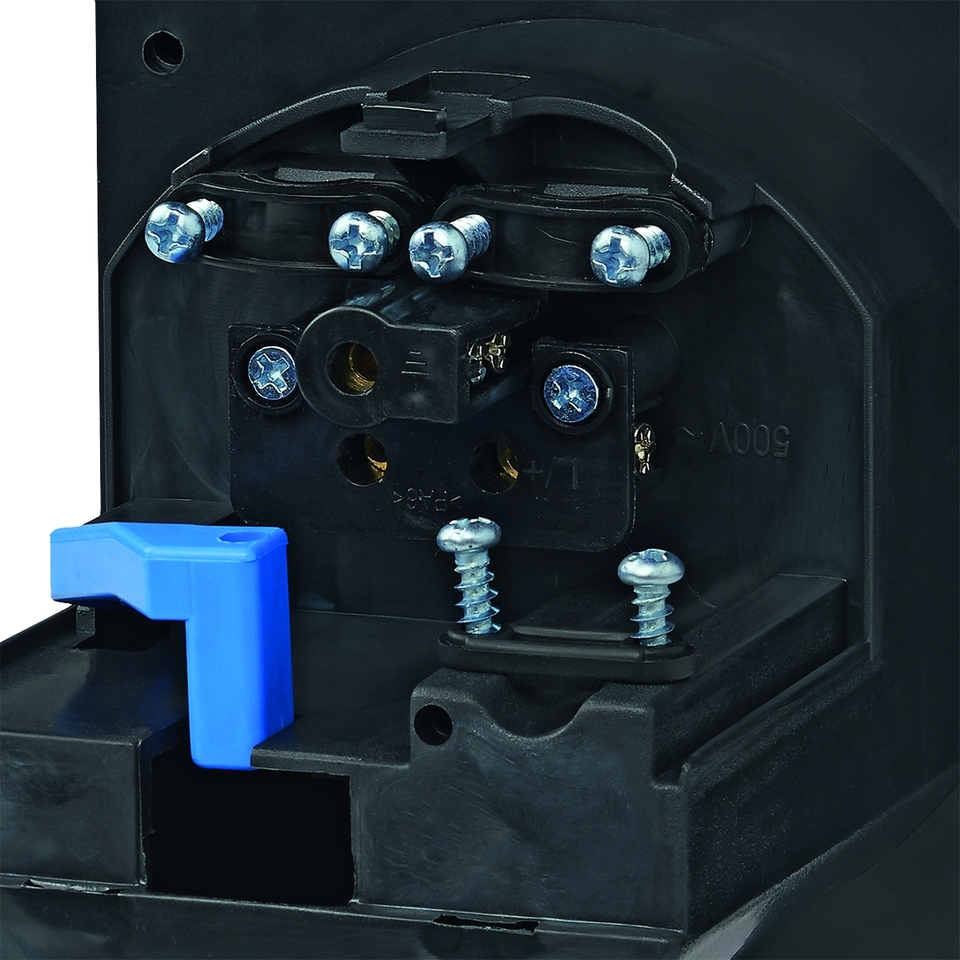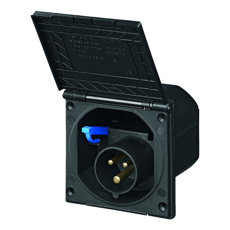 Zásuvka 16 A / 230 V. Odolné proti stříkající vodě. Výřez ø 94 mm. Velikost 105 x 105 mm. Hloubka 81 mm.