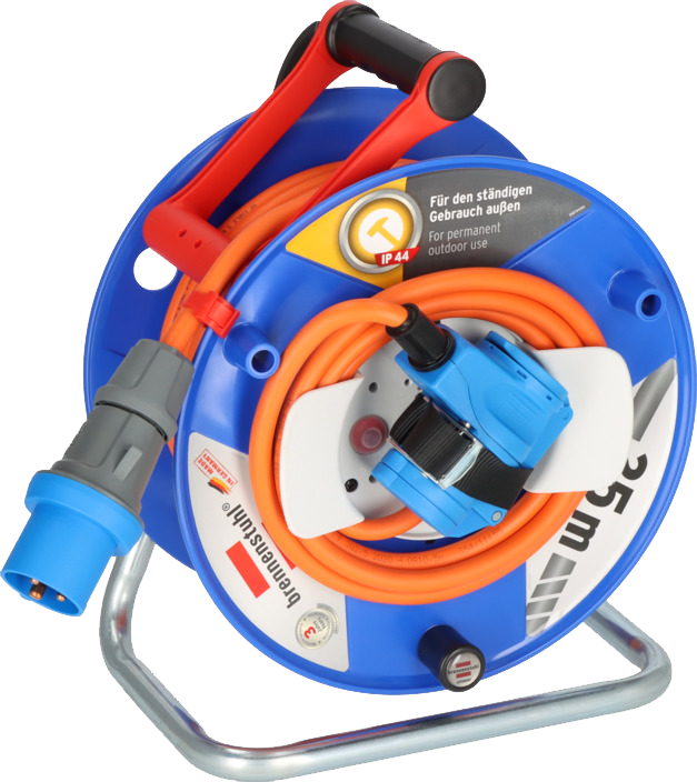 Vlastnosti: Úhlová zásuvka CEE 230 V/16 A včetně kombinované uzemněné zásuvky 230 V se samouzavíracím krytem a zástrčkou CEE 230 V/16 A. Prodlužovací naviják s navíjecí zástrčkou a konektorem. Inovativní rukojeť „cablepilot“ pro perfektní správu kabelu. Otočné madlo na obou stranách pro pohodlné přenášení a zavěšení. S otočnou rukojetí pro pohodlné navíjení. Tělo navijáku ze speciálního plastu na pozinkovaném nosném rámu. Popruh pro snadné navíjení a odvíjení kabelu. Kabel (H07RN-F 3G2,5) v signální oranžové barvě, užitečný pro prevenci potenciálního nebezpečí zakopnutí.