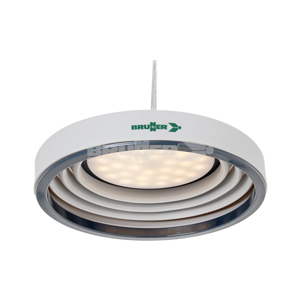 LED světlo do stanu a markýzy se skládacím tělem (skládací systém). Silikonové pouzdro, moderní technologie LED stmívače, se závěsným hákem a 5 m připojovacím kabelem, systém nastavení výšky, vypínač. 230 V/10 W. Světelný tok 550 lm. Rozměry (øxV) 18,5 x 12 cm. Hmotnost 350g.