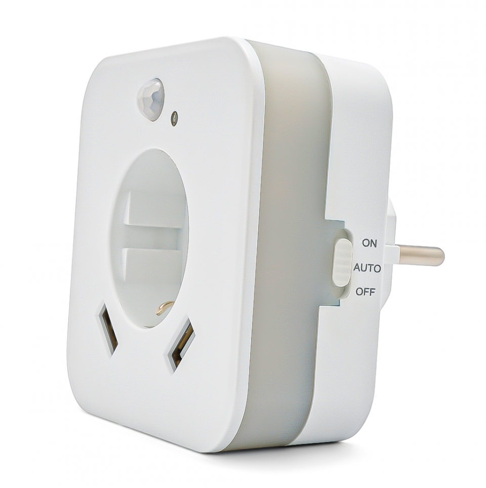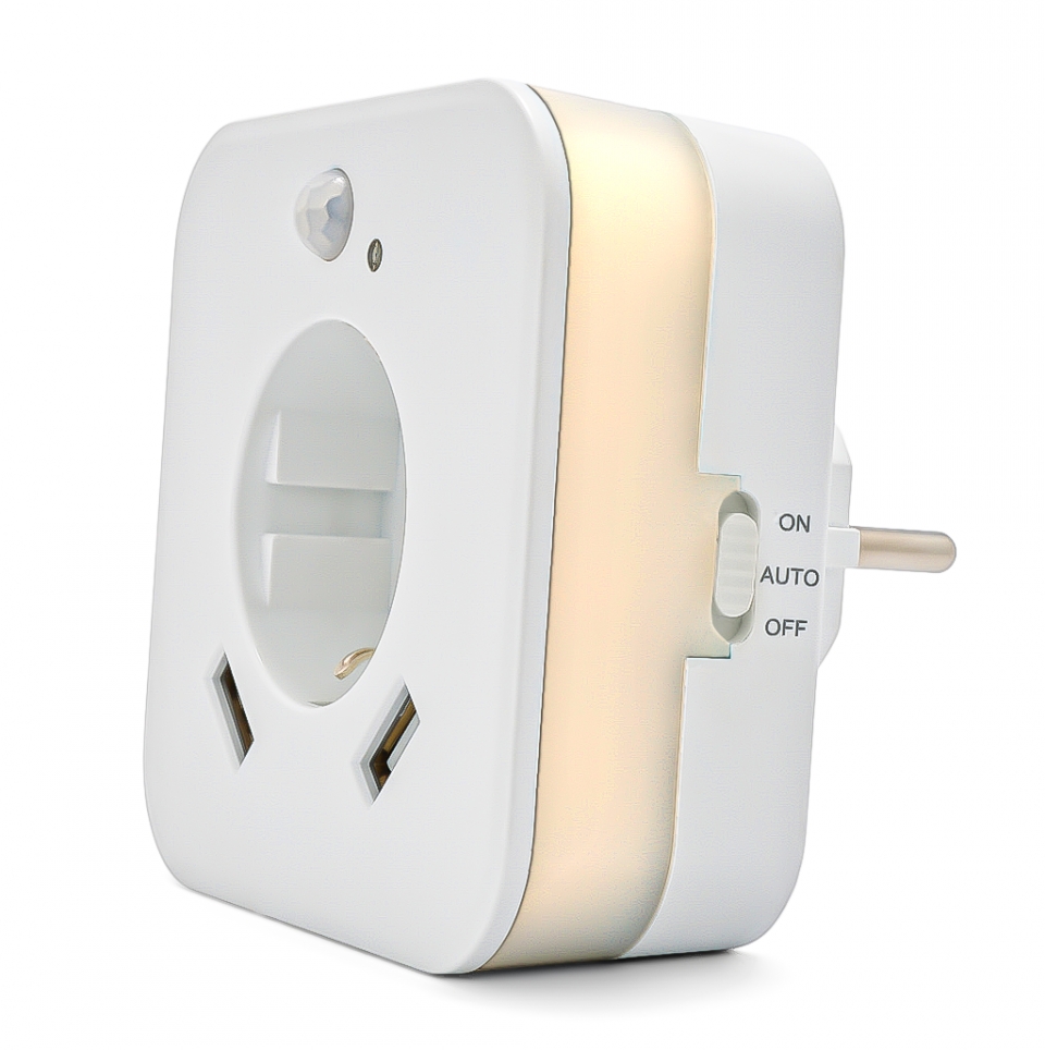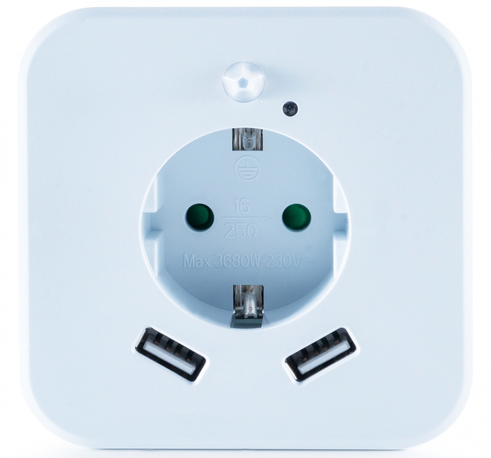 Zásuvka s 2 x USB a orientačním LED světlem. S pohybovým senzorem a dětskou pojistkou. Technické údaje: barva světla 2700K, výkon 0,3 W, zásuvka max. 3 680 W - 230 V, 2 x USB 2,4 A, dosah snímače 3 m, rozměry 85 x 85 x 72,5 mm, hmotnost 140 g.