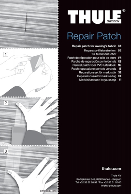 Opravná páska pro markýzy Thule. Skládá se ze 3 průhledných, samolepicích speciálních lepicích podložek 7,5 x 15 cm.