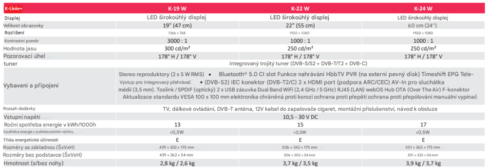 Rozsah dodávky: TV, dálkové ovládání, anténa DVB-T, kabel zapalovače cigaret 12 V, montážní příslušenství, uživatelská příručka