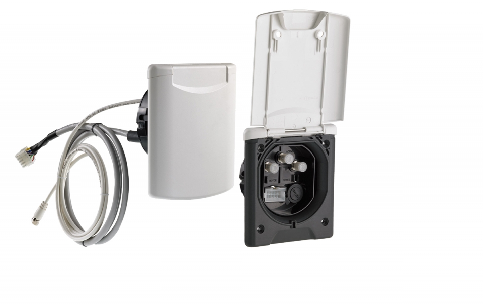 Externí zásuvka pro ActivSat. Materiál: ABS. Barva: bílá venku, černá uvnitř. Vstupy: Konektor pro ActivSat 10pinový motorový kabel, F konektor pro koaxiální kabel ActivSat, F konektor pro druhý koaxiální kabel (ActivSat Twin), F konektor pro koaxiální kabel pro externí TV, 12 V DC univerzální zásuvka (max. 10 A) s gumovým krytem a rychlospojky pro napájení externí TV.