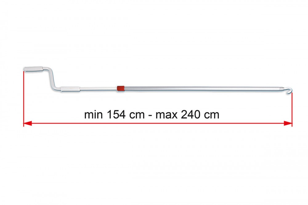 Teleskopická klika s pevnou rukojetí, ideální pro vysoké obytné vozy a střešní markýzy (standardně dodávány s F70, F45L, F80s, F65L a F65s). Hmotnost: 0,7 kg.