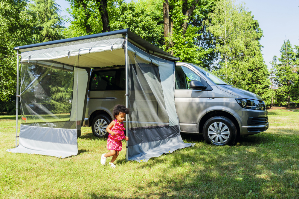 • Room Van Premium: Boční stěny s rolovacími okny a moskytiérou a přední stěna s dveřmi a oknem s rolovací clonou