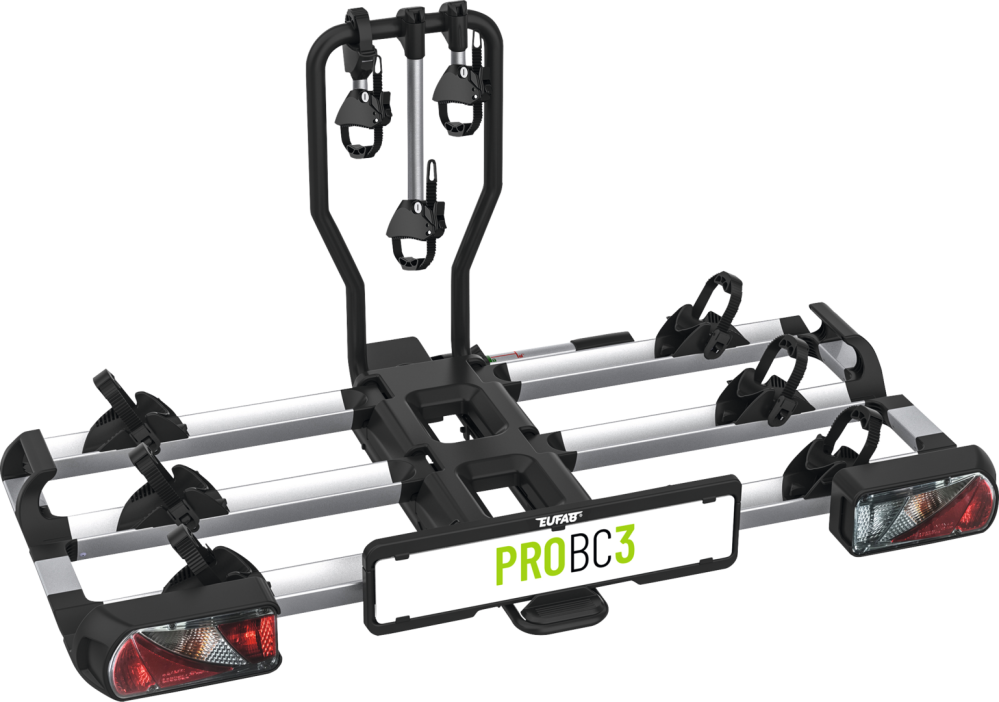 PROBC3. Pro 3 jízdní kola (4 s prodloužením). Max. užitečné zatížení 60 kg (30 kg kolejnice 1+2, 20 kg kolejnice 3). Rozměry (ŠxVxH) 140 x 69 x 74 cm, složený 30 x 71 x 74 cm. Hmotnost cca. 22 kg.