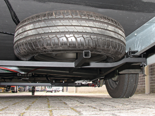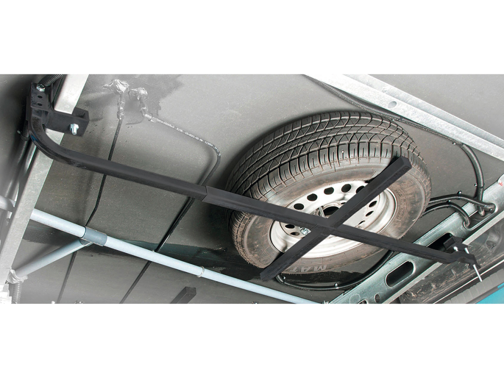 Držák rezervní pneumatiky je ideálním řešením! Flexibilní držák rezervní pneumatiky lze snadno namontovat pod podvozek. To umožňuje montáž vozíku i rezervní pneumatiky pod podvozek. Držák rezervní pneumatiky se snadno instaluje a nevyžaduje žádné vrtání.