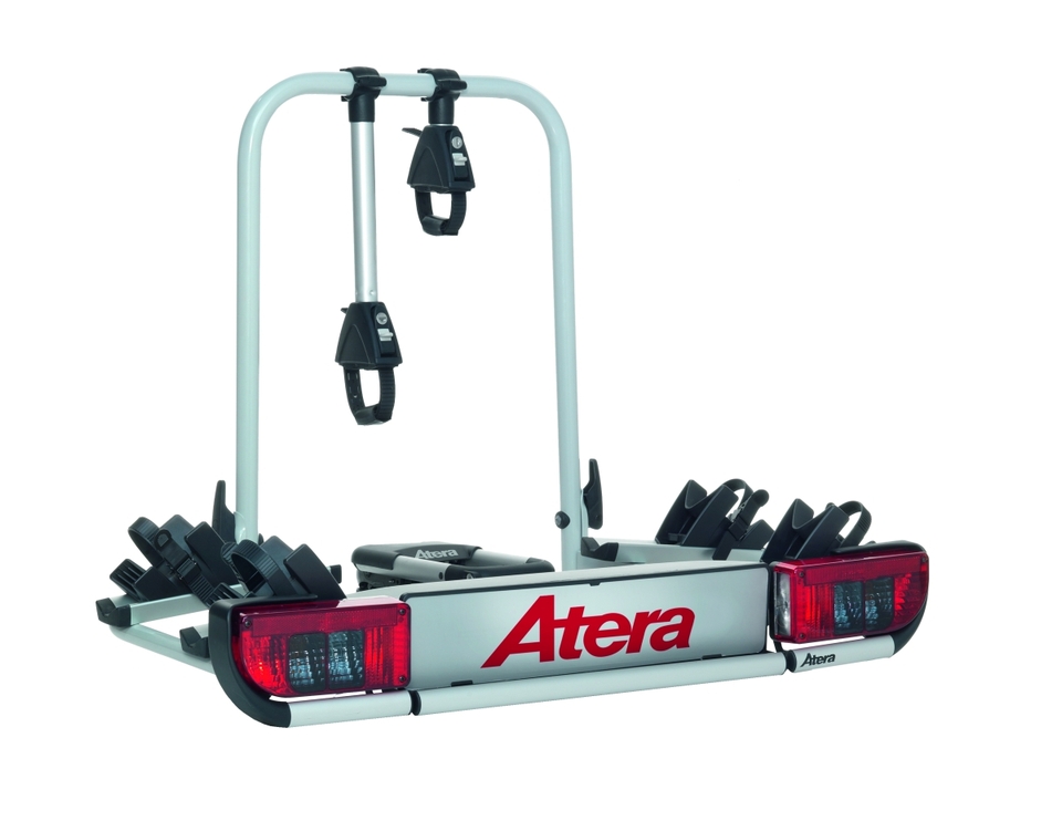 Atera STRADA E-BIKE M. Výkonný nosič pro 2 kola. Rozšiřitelné na 3 kola extra velké. Extra velké vzdálenosti mezi kolejnicemi jízdního kola pro převislé elektromotory a baterie.
