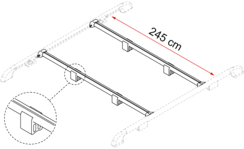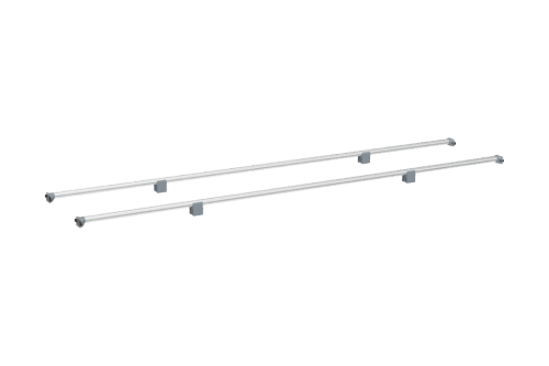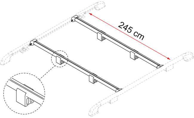 Snadno zkracovatelné. 2 nosné tyče (délka 245 cm) se 2 montážními bloky každá.
