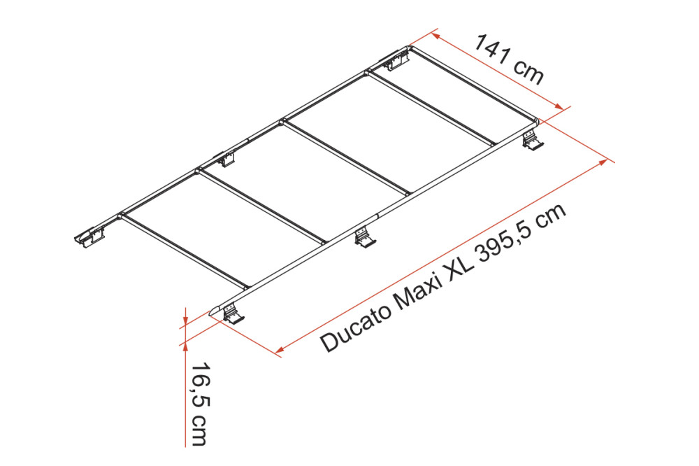 Hliníkové střešní nosiče Ducato Maxi XL. Vhodné pro Ducato s vysokou střechou H2 a délkou L4. Hmotnost 13,5 kg.