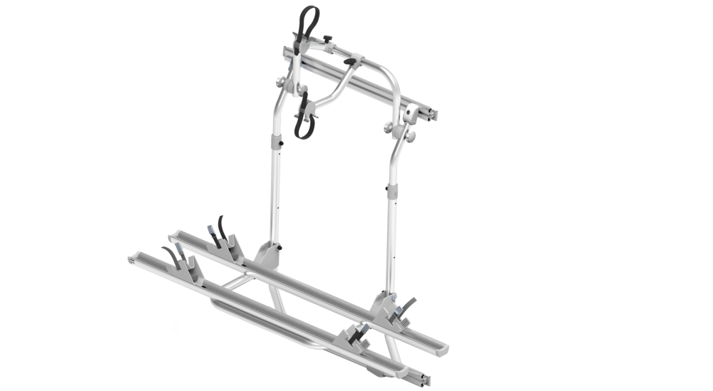 Základní rám z eloxované hliníkové trubky, 2 hliníkové kolejnice na kolo 137 cm dlouhé se 2 skořepinami kol, každý včetně 2 ráčnových popruhů, 2 upevňovacích háčků, 2 napínacích kolejnic pro montáž na vozidlo. Max. zatížení až 2 jízdních kol. Maximální nosnost 35 kg.