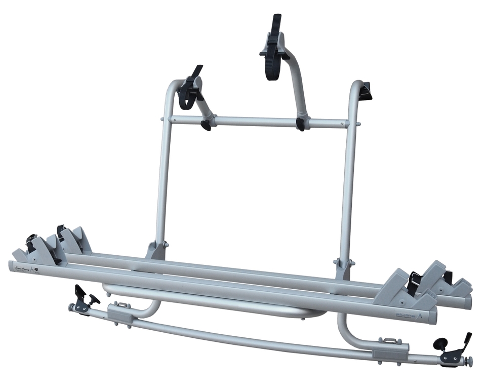 Elegantní, stabilní hliníkový nosič kol. Montáž probíhá bez vrtání, nosič se zavěsí na zadní výklopné dveře pomocí upínacích čelistí a upevní a zajistí upínacími prvky. Dodatečné zajištění napínacími pásy. Snadná konstrukce. Základní rám z eloxované hliníkové trubky, 2 hliníkové kolejnice na kolo každá se 2 skořepinami kol a 2 popruhy, 2 upevňovací drápky.