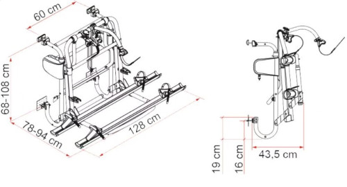 Flexibilní nastavení výšky. Se zkracovatelnou manévrovací tyčí a magnetickou spojkou. Pro přepravu až 4 standartních nebo 2 elektrokol.