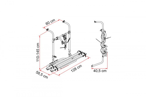 Vhodné pro karavany se slabými a šikmými zadními stěnami. Horní držáky jsou připevněny ke stávající liště nad zadním oknem. Spodní držáky jsou připevněny k zesíleným bodům. Výškově nastavitelné. Uveze 2 jízdní kola. Max.nosnost 35 kg. Hmotnost 6,4kg.