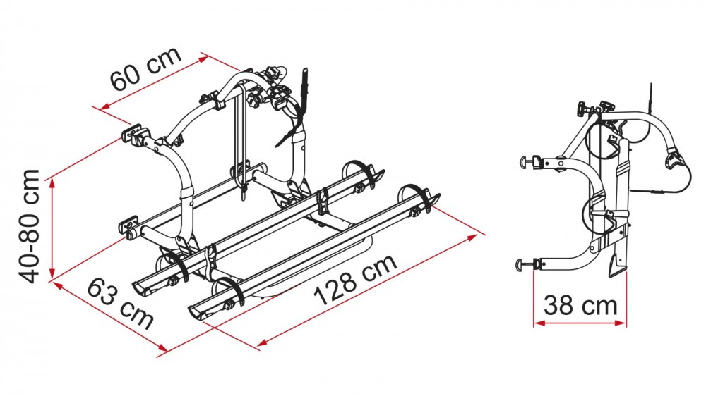 Výškově nastavitelný rám. Pro přepravu až čtyř standardních kol nebo dvou elektrokol.